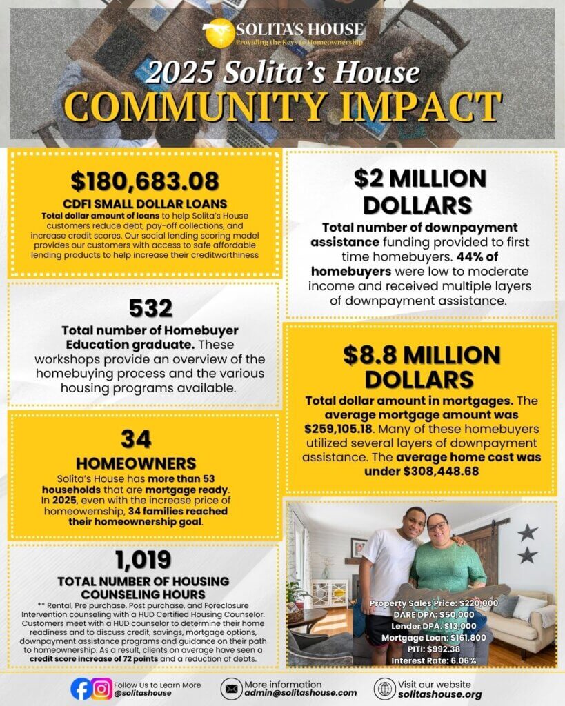 The mission of Solita’s House, Inc. is to build the financial capabilities of the people and communities we serve. We meet our mission by providing personal financial education, homebuyer education and assistance with credit counseling, housing counseling, debt and money management and home retention programs through educational programs and confidential counseling. We complement these services with specialized financial products such as affordable credit building loans and individual development savings accounts with matched savings. As an HUD-approved Housing Counseling Agency Solita’s House helps low and moderate income persons attain homeownership and preserve their homes.